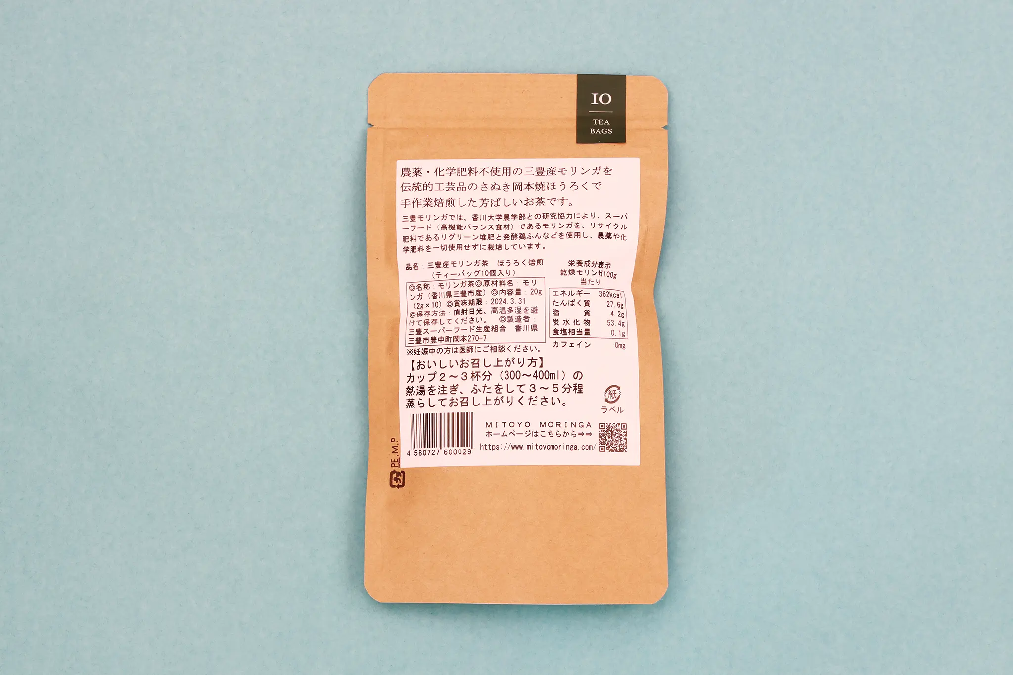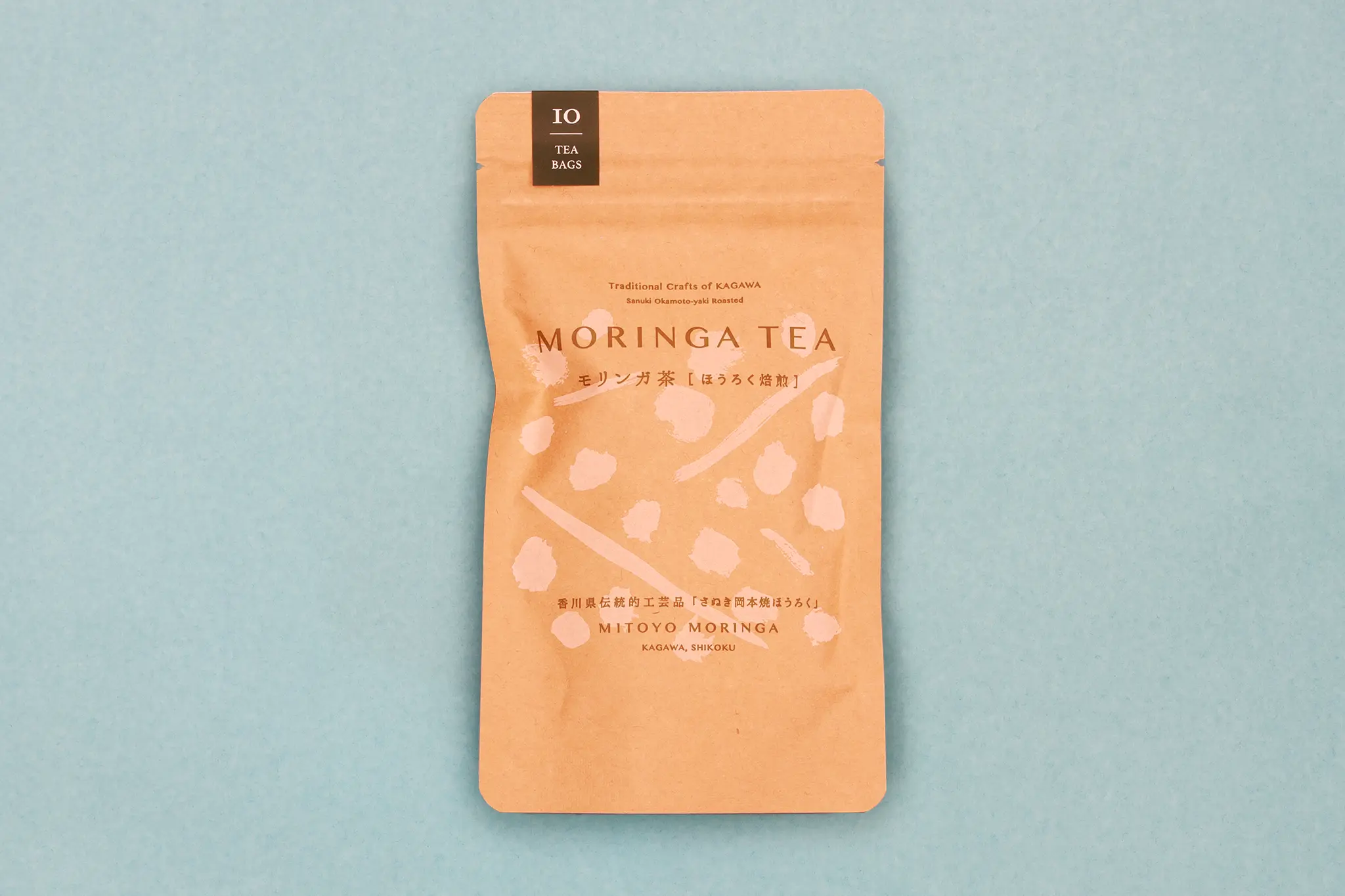 MITOYO MORINGA(三豊モリンガ)は、香川大学農学部との研究協力により、三豊市での最適な栽培から収穫、そして製造、梱包まで、完全国内生産にこだわっています。リサイクル肥料であるリグリーン堆肥を使用し、農薬や化学肥料を一切使わず、健康と環境に最大限配慮。「モリンガ茶[ほうろく焙煎]」は、三豊市の伝統工芸品である「さぬき岡本焼き」のほうろくで手作業焙煎をすることで、芳ばしく仕上がっています。